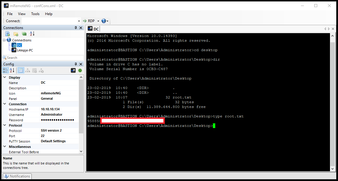 The password is encrypted with AES in GCM mode with a hardcoded key in the .xml file, then base64 encoded. Because I was under time pressure to get the system flag, I decided to spin up a Windows VM and install mRemoteNG instead of trying to find a way to recover the password. I found some ruby script on packetstorm that decrypts the password but it only works for CBC mode and therefore was of no use for me here.