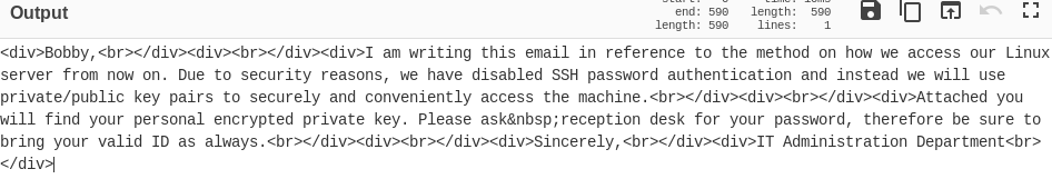 There’s an attachment in the email with an SSH private key: bobby.key.enc