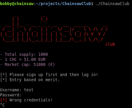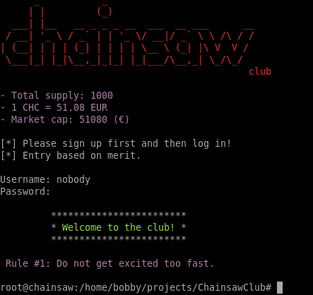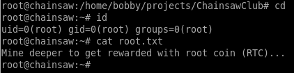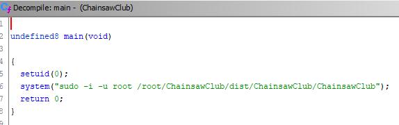 I disassembled the binary with Ghidra to see how it works and saw that it simply executes another binary from root’s home directory. I don’t have access to root yet so I can’t disassemble the /root/ChainsawClub/dist/ChainsawClub/ChainsawClub file.