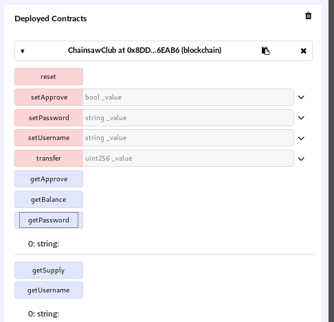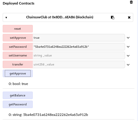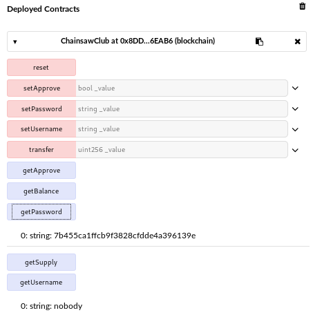 The program is probably looking at the contract to get the username and password. I have the address so I should be able to invoke the setUsername and setPassword methods to change the credentials and then log in. I compiled the contract and pointed it at the address 0xCeC270D64E45aDc8C6057C764f13448d500de096 from the address.txt but I wasn’t able to pull any data from it. It probably doesn’t exist in the blockchain.