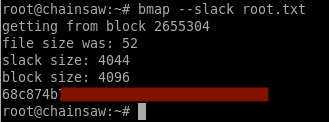 I found the flag hidden in the slack space of the root.txt file. I used the bmap utility already installed on the system.