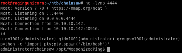 After getting the reverse shell I dropped my SSH public key into the /home/administrator/.ssh/authorized_keys file so I can log in directly.