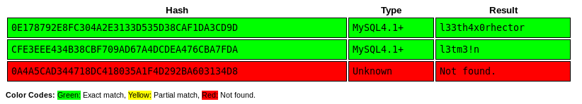 password hash: *0E178792E8FC304A2E3133D535D38CAF1DA3CD9D
