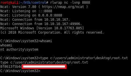 Control runs a vulnerable PHP web application that controls access to the admin page by checking the X-Forwarded-For HTTP header. By adding the X-Forwarded-For HTTP header with the right IP address we can access the admin page and exploit an SQL injection to write a webshell and get RCE. After pivoting to another user with the credentials found in the MySQL database, we get SYSTEM access by modifying an existing service configuration from the registry.