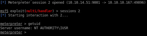 Defender is running on this machine so my earlier attempst at uploading a meterpreter compiled EXE file failed and using the PHP meterpreter proved to be somewhat unstable. However I was able to generate an MSbuild XML meterpreter/reverse_tcp payload with GreatSCT and get a stable shell.