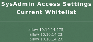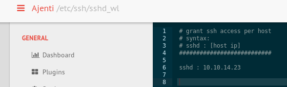 We still can’t connect to the SSH service though, we need to fix that first. The /etc/ssh/sshd_wl file is a whitelist that can be modified so we can add our IP address.