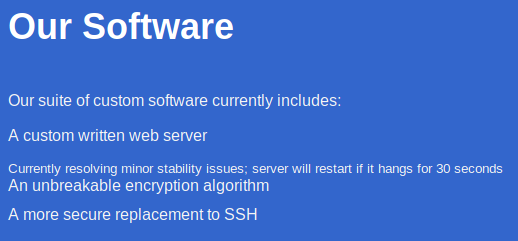 So this company is taking a unique approach based on security by obscurity, what could go wrong? It’s pretty clear I’m gonna have to exploit a custom webserver here based on the notes from the webpage. It also says they’re working on a new encryption algorithm and a replacement for SSH. I’m sure the folks from Crown Sterling would be interested in this crypto vaporware garbage!