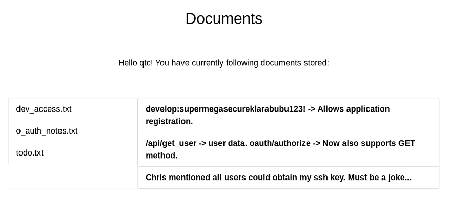 The documents has the develop:supermegasecureklarabubu123! credentials and an API endpoint /api/get_user