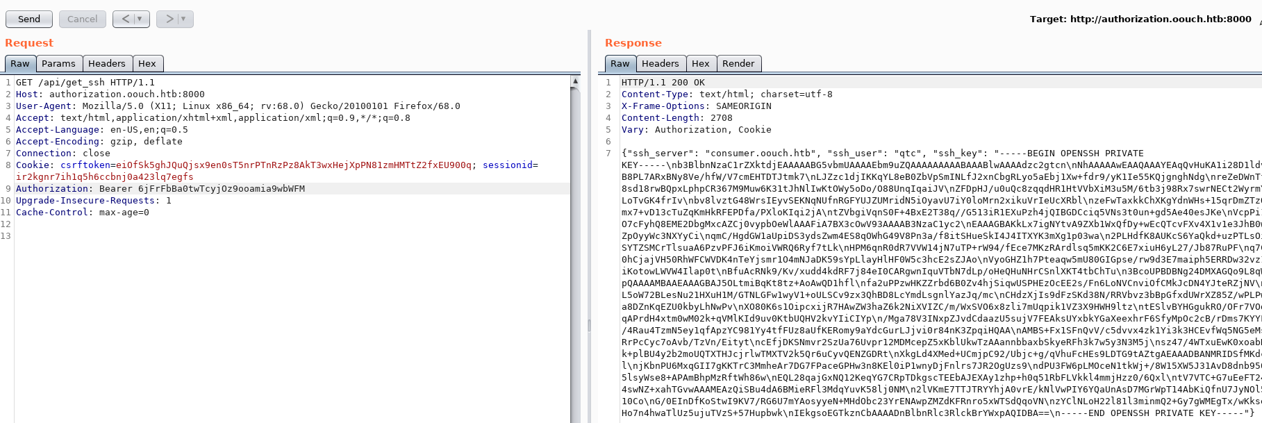 After some fuzzing based on the SSH hint earlier, we found the get_ssh endpoint which returns the SSH key for user qtc