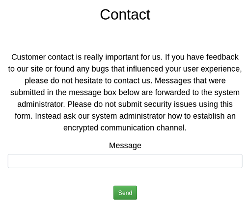 There’s also a contact section. Now that’s pretty interesting because it could be a target for an XSS since the page says the messages are forwarded to the administrator.