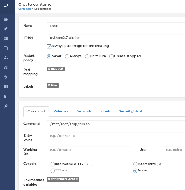 - Once logged in, we use the portainer app to create a privileged container and get root access