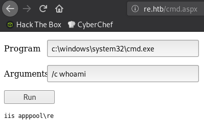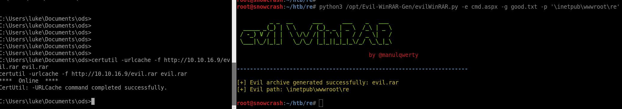 I had fun solving RE but I did it using an unintended path. After getting a shell with a macroed .ods file, I saw that the Winrar version had a CVE which allowed me to drop a webshell in the webserver path and get RCE as iis apppool\re. The user had access to modify the UsoSvc service running with SYSTEM privileges so it was trivial at that point to get a SYSTEM shell. Because the root flag was encrypted for user Coby, I used meterpreter to impersonate his token and read the file.