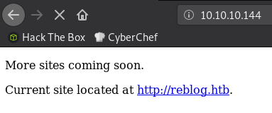 The IP website redirects to reblog.htb so I’ll add that domain to my local hostfile.