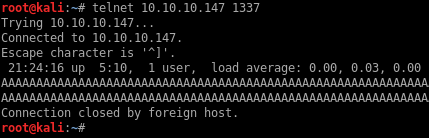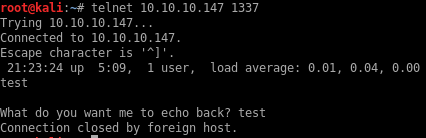 The service on port 1337 shows the output of uptime then echoes back whatever is typed by the user. The connection drops after the input is echoed back.