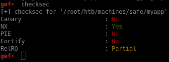 With gdb and the gef extension, I check what kind of protections are enabled and notice that NX is enabled but PIE isn’t:
