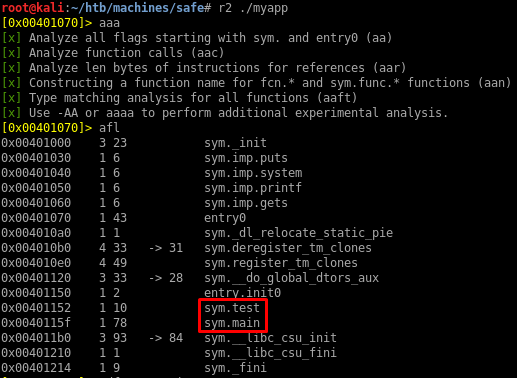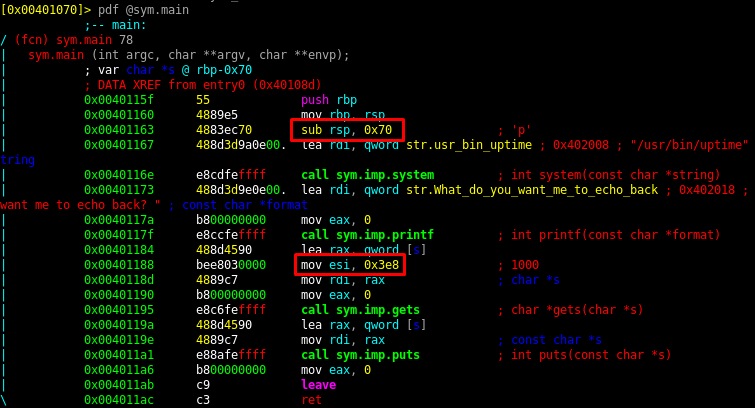 I don’t know if ASLR is enabled or not on the box though. Time to disassemble the binary and understand how the program works. I’ll use radare2 for this: