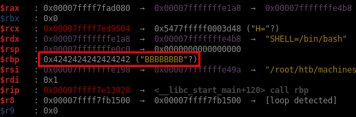 I’ll generate a payload of 112 A’s (as per the disassembly analysis) + 8 bytes containing B. If I’m right, the B’s will land into RBP after the function returns.