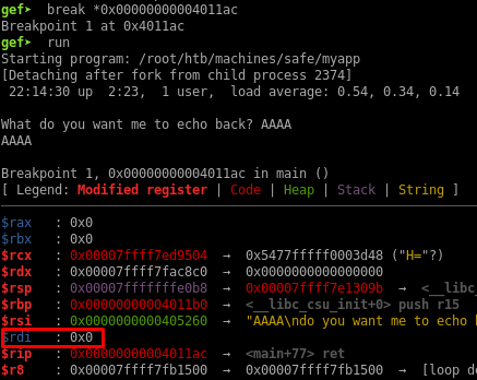 I’ll put a breakpoint on the return instruction from the main function and check what the RDI register is pointing to: