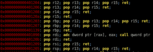 Next, I’m gonna use ropper -f myapp to look for gadgets I can use to control registers: