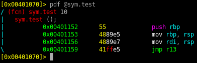 The other function sym.test doesn’t do anything useful at first glance: it just moves a few registers and jumps to the memory address contained in the r13 register. Normally, functions return with ret instruction but this one doesn’t, very odd.