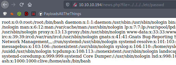 There’s a very obvious arbitrary file read vulnerability in the news.php file and we can read any file with path traversal. Here I grabbed /etc/passwd and found the ash user: