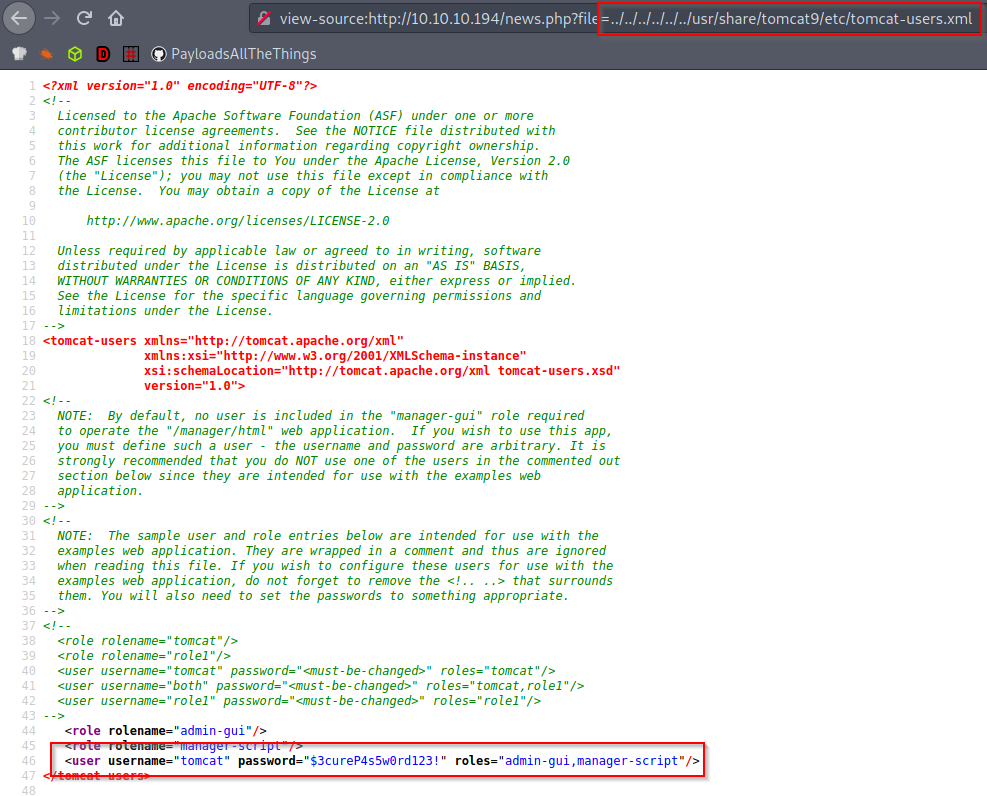 The Tomcat credentials are usually stored in the tomcat-users.xml file. I looked for it in /etc/tomcat9/tomcat-users.xml but the file wasn’t there so instead I installed Tomcat locally and checked where it could be hidden: