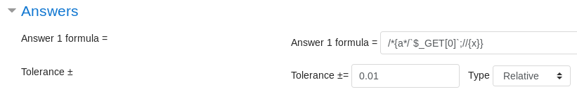 We can put anything in the question name and text but for the formula we enter /*{a*/`$_GET[0]`;//{x}}
