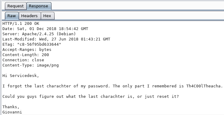 If we look at the file with Burp, we see that the file contains part of a password: Th4C00lTheacha. We can guess that the user is probably named Giovanni based on the note.