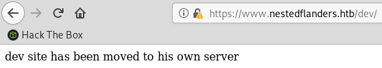 The /dev/ doesn’t have anything interesting. I check the vhost dev.nestedflanders.htb but that doesn’t seem valid and I get directed to the page with the single dot.
