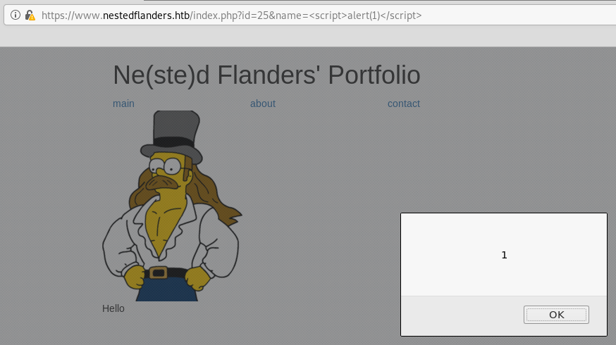There’s nothing at first glance that seems dynamic other than the id parameter used to include pages. After manually trying other parameters, I find that the name parameter is used by the page to change the name displayed and is vulnerable to XSS. It’s a reflected XSS so I don’t see how this would be useful here. Moving on.