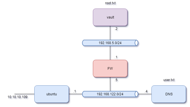 ovpnconfiguration file that let us get a reverse shell there - There’s yet another network segment and host that we discover by looking at the routing table and host file