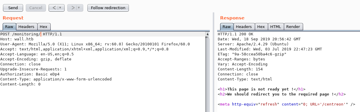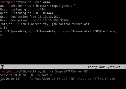 Wall is running a vulnerable version of the Centreon application that allows authenticated users to gain RCE. The tricky part of this box was finding the path to the application since it’s not something that normally shows up in the wordlists I use with gobuster. The intended way was to bypass the HTTP basic auth by using a POST then the redirection contained a link to the centreon page but instead I did some recon on the box creator’s website and saw that he had written an exploit for Centreon and guessed the path accordingly. The priv esc was the same used on Flujab: a vulnerability in screen that allows the attacker to write to any file on the system.