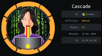Cascade was a simple and straightforward enumeration-focused Windows box. We find the credentials for the initial account in a custom LDAP attibute then enumerate SMB shares, finding VNC credentials which can be decrypted. With those creds we find an SQlite database that contains encrypted credentials for yet another user. To decrypt the password we have to reverse a simple .NET application located on one of the shares. The final privesc involves getting the admin password from tombstone, a feature in AD that keeps deleted objects for a period of time.