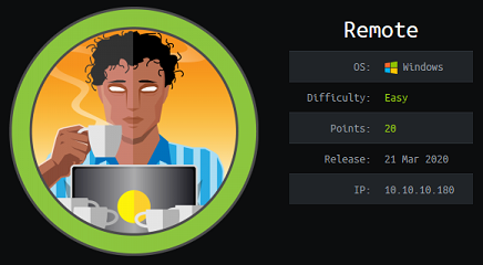 Remote is a beginner’s box running a vulnerable version of the Umbraco CMS which can be exploited after we find the credentials from an exposed share. After landing a reverse shell, we find that the machine has TeamViewer installed and we can recover the password with Metasploit then log in as Administrator.